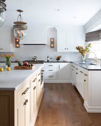 A simple design using white cabinets along with black countertop backsplash coveys a bold yet inexpensive and vibrant kitchen. Dark color wood floor white shaker kitchen cabinets, white subway glass backsplash, and island and white black countertops. Industrial loft kitchen with black countertops, black cabinet hardware, black range hood and black ceiling. This is an example of a kitchen incorporating New kitchen with black cabinets throughout with light beige and dark brown granite. A massive blue, dark gray and white tile backsplash I think... Popular white kitchen cabinets gleam with pizzazz, do you agree? If you are considering white to